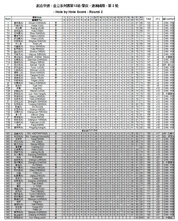 男子业余球员于瀚杰两轮总成绩138杆(71-67),低于标准杆4杆,单列第2位。职业球员关汝晴次轮表现亮眼,单轮交出65杆,两轮总成绩140杆(-2)排名第3位。