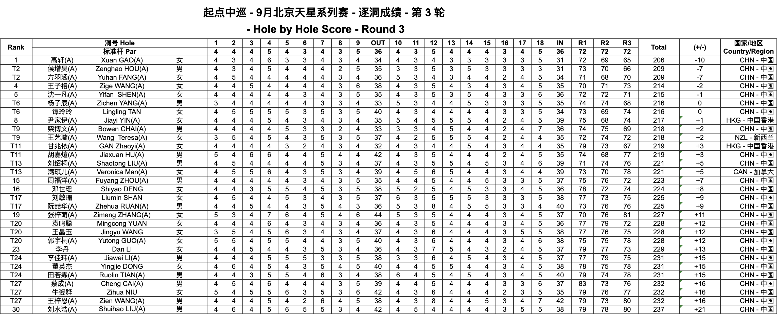 男子业余球员侯增昊今日交出1鹰5鸟2柏忌的66杆,三轮总成绩同样209杆,与36洞领先者方羽涵(71-68-70)并列第2位。女子业余球员王子格以总成绩214杆(70-71-73)单列第3位,沈一凡则三轮交出215杆(72-72-71),排名第4。女子职业球员谭玲玲和男子业余球员杨子辰均以216杆总成绩排名T6,中国香港业余女子球员尹家伊总成绩217杆排名第8,中国男子业余球员柴博文与新西兰女子业余球手王艺璇排名并列第9位。