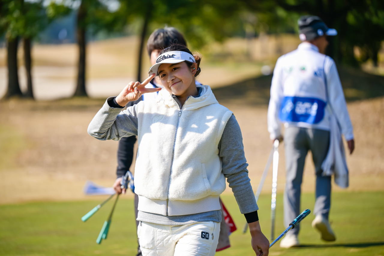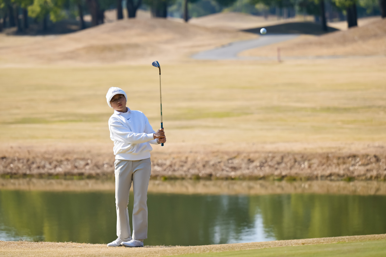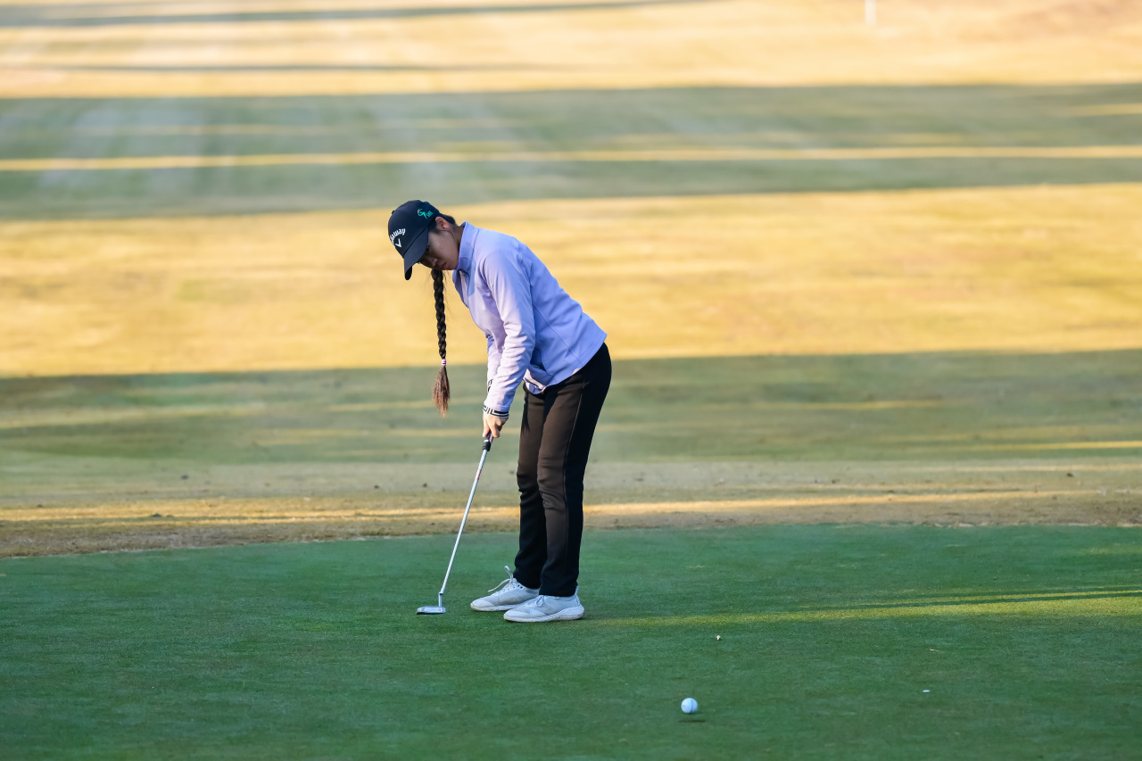 早上8:10,36洞领先者金雨薇从1号洞出发,一路保帕至4号洞,三推吞下一个柏忌,好在她迅速调整状态,虽然在6号洞第2杆打进沙坑,但她第3打顺利救球至洞边十码左右,以一记长推入洞抓到今天第一只小鸟。8号洞,14岁小将因为开球失误,再次打出+1,前九以1鸟2柏忌作结。转场后,在11号、15号两个五杆洞中,她重获开球好手感,均是三杆将球送至洞边一码不到,推杆进洞,连抓两只小鸟,将比分拉回。“上半场我有很多开球没有开好,都在树根底下之类的,但是救的还不错,成功保帕。”金雨薇在赛后复盘时说,“今天整体表现还可以,虽然前九打的比较挣扎,但是推杆推进了几个比较远长推,也给我救回来了几杆。”