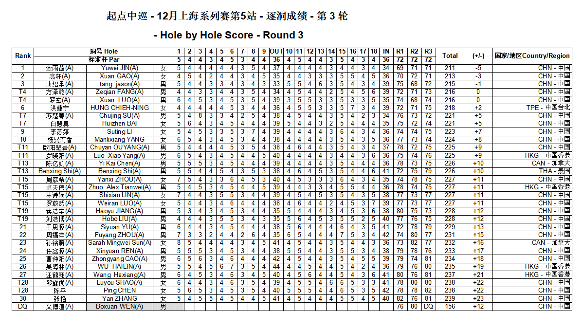 来自上海的女子业余球员高轩三轮总成绩213杆(70-72-71),低于标准杆3杆,单列第2位;男子业余球员唐绍承决赛轮交出72杆,三轮总成绩215杆(75-68-72),排名第3位;起点中巡三冠王方泽乾与美国圣何塞州立大学校队成员罗玄分别交出(72-71-73)、(74-68-74)的216杆,以平标准杆并列第四。