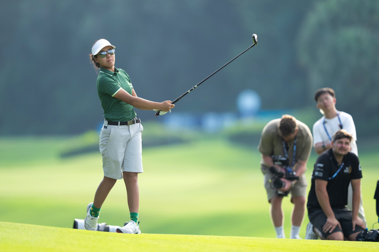 作为首轮领先者,彭严萱继续着跌宕起伏的状态。与倪梓心同组出发,她在8、9号洞都吃下柏忌,失去了榜首之位。进入10号洞,在错过了标准杆上果岭的情况下,她用56度杆切进15码的下坡小鸟,提振了士气。“前面连打了2个柏忌,当时不太开心。切进了这个小鸟后,我一下子就释怀了,也稍微放开了一点。”