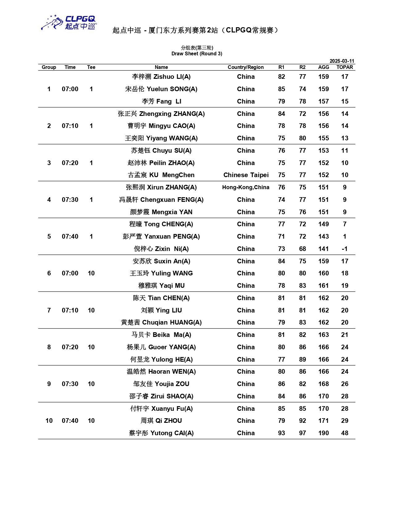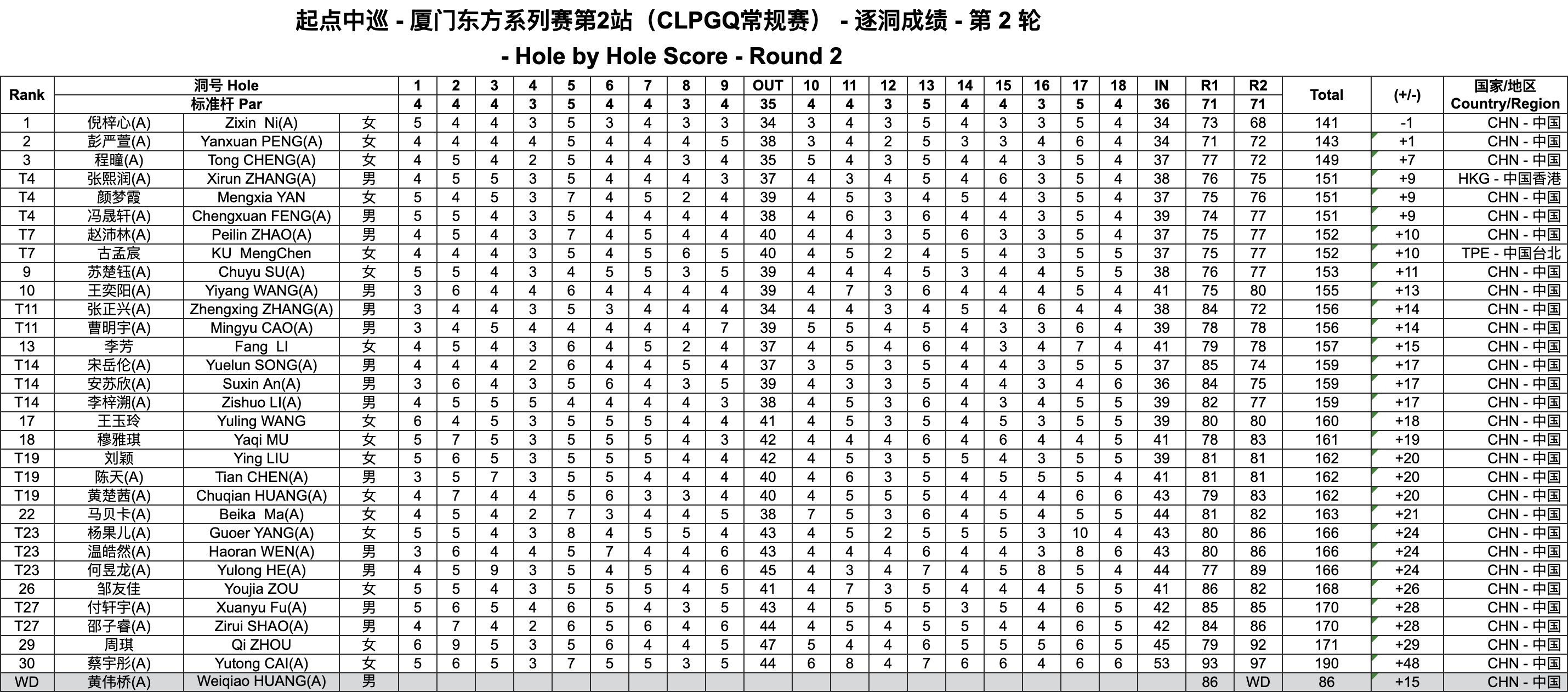 主场作战的业余选手程瞳第二轮稳住阵脚,交出149杆,排名第3位。中国香港球员张熙润携手冯晟轩及起点中巡冠军球手颜梦霞,以151杆并列第4名。中国台北职业球手古孟宸、深圳大学学生赵沛林都凭借着152杆并列第7位。
