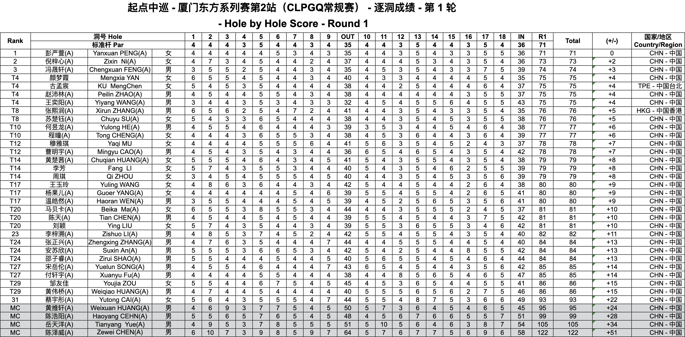 重庆籍选手彭严萱因为正在调整动作,发挥较为起伏。首轮,她签下4只小鸟、4个柏忌的计分卡,以71杆(E)位列榜首。