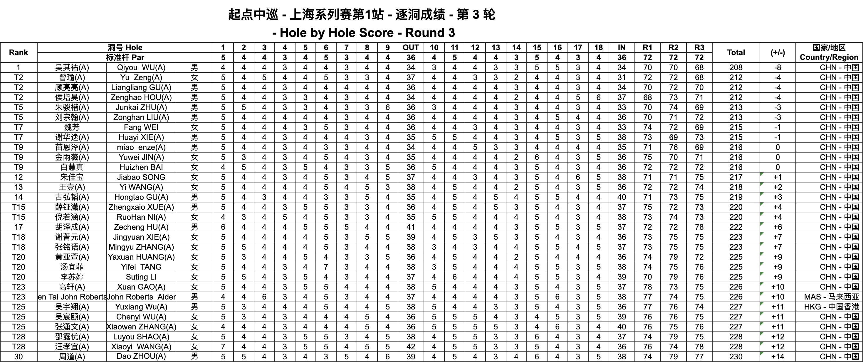 男子业余选手朱骏楷、刘宗翰均以三轮总成绩213杆排名T5;女子职业球员魏芳、男子业余小将谢华逸以215杆总成绩排名并列第7位。