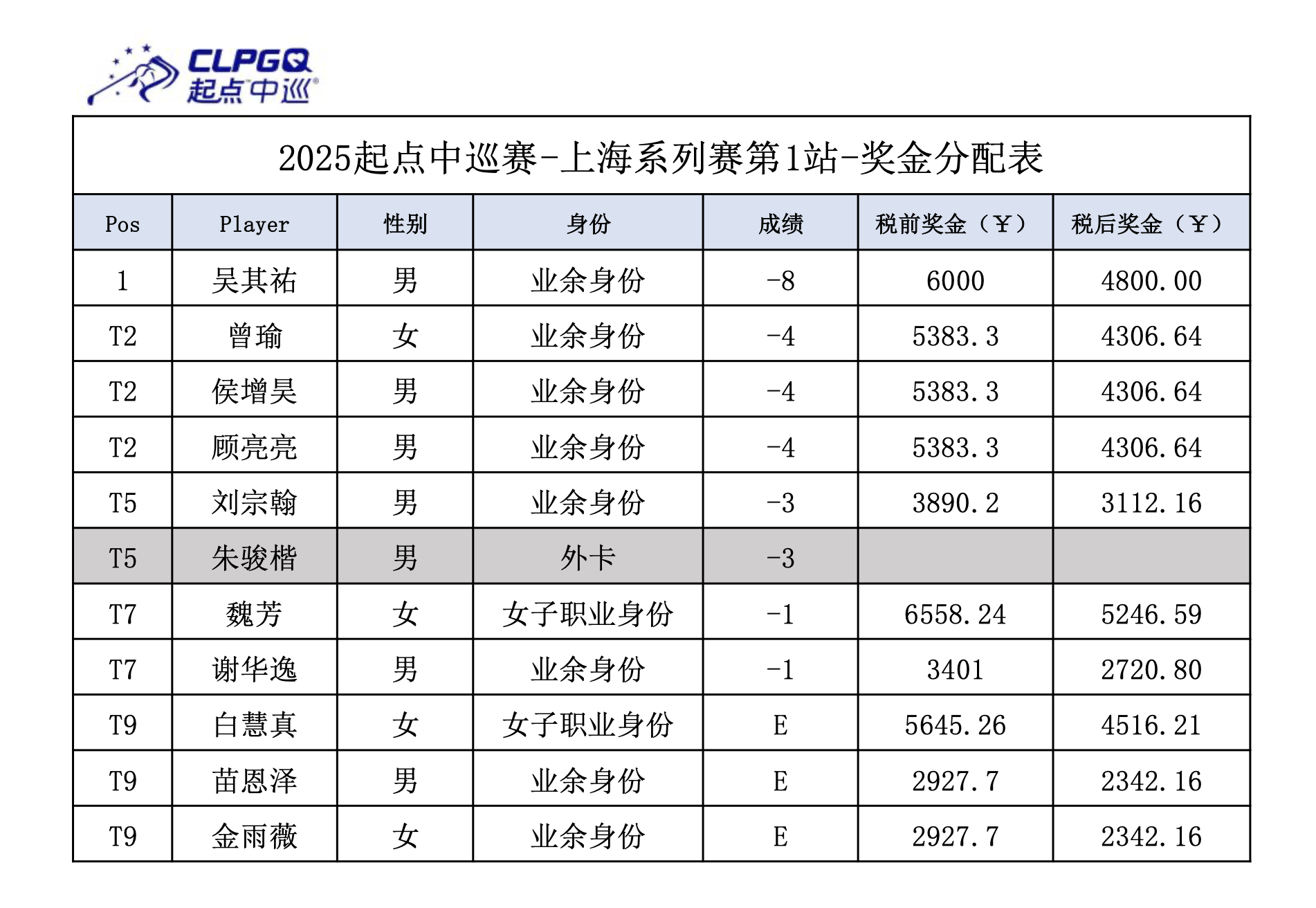 起点中巡冠军球员顾亮亮今日发挥稳中有进,交出3鸟1柏忌的70杆,也以并列第二位完赛。