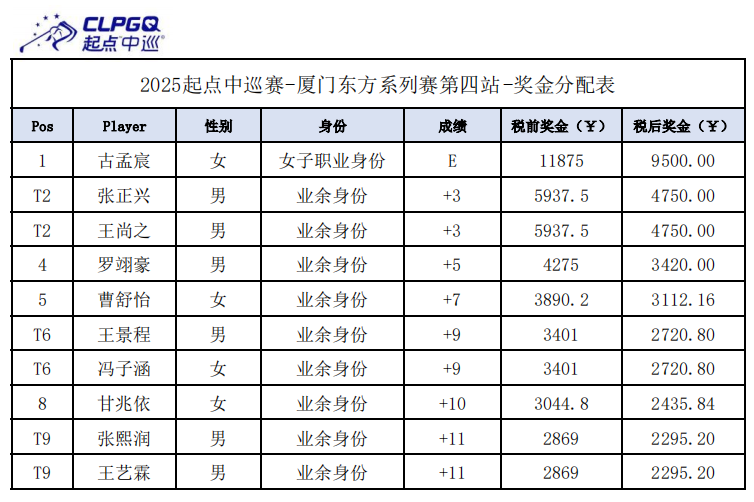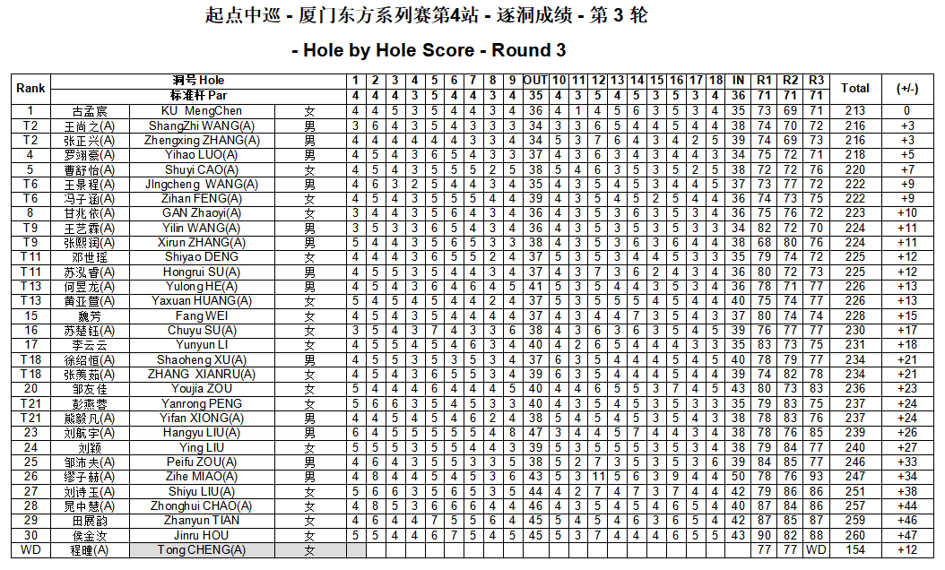 北京时间5月13日,起点中巡厦门东方系列赛第4站(CLPGQ常规赛)在厦门东方高尔夫俱乐部AC场(男子:6485码,女子:5687码,标准杆71杆)圆满落幕。女子职业球员古孟宸以三轮总成绩213杆(73-69-71),3杆优势成功登顶,赢得起点中巡首冠。