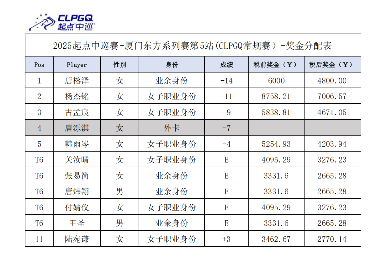 至此,起点中巡-厦门东方系列赛第5站(CLPGQ常规赛)的角逐落下帷幕。一周后,起点中巡将奔赴北京,开启起点中巡-北京明珠WAGR积分系列赛第3站的冠军争夺。哪些潜力球员将来到赛场,她们之间又会碰撞出怎样的火花,静待9月15至16日揭晓!